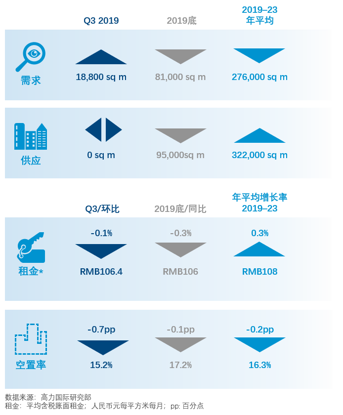 虽然市场新增供应达到历史高值,但由于大部分新项目预租情况良好,市场净吸纳量较上季度显著回升。租金方面,由于本季各地区空置率均有不同程度上升,业主间竞争加剧,导致全市平均租金环比进一步下降0.5%。