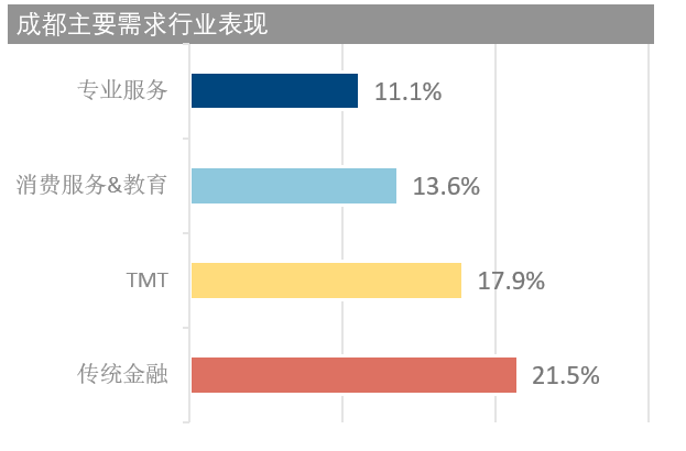 此外天府新区作为成都正在崛起的新兴写字楼商圈,到2025年,写字楼供应量将达到250万平方米。其中央国企自用办公楼占比超过六成。随着该区域首批国有企业办公项目陆续投入使用,我们预计未来将有更多央国企及其下属关联企业搬迁至天府新区,或将导致其他商圈出现大面积退租,建议业主应提前做好应对措施。