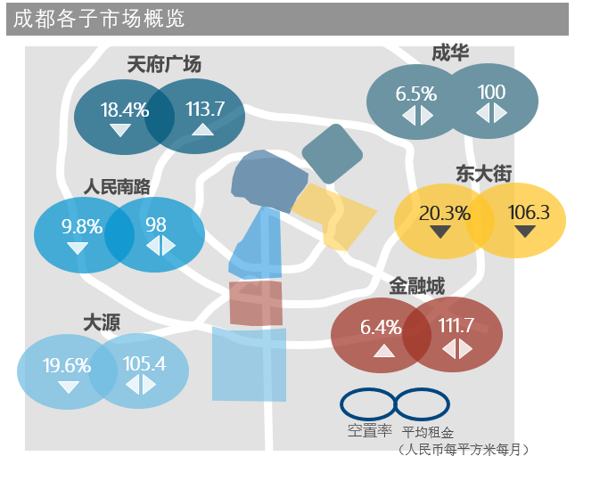 本季,甲级写字楼租赁需求不再由高新区(大源,金融城商圈)主导,市中心项目凭借更高性价比,以及更多可选择的办公面积,重新赢得租户青睐。本季度市中心传统中央商务区(天府广场和东大街商圈)以60%的面积主导成都甲级写字楼租赁市场,天府广场空置率环比下行0.6个百分点至18.4%,东大街空置率环比下行0.8个百分点至20.3% 。由于市场整体租赁需求减少,市场转变为租户市场,市中心的甲级写字楼业主通过降低租金、提供定制装修、提高免租期等方式吸引客户。至三季度末,东大街租金环比下降0.7个百分点至106.3元每平方每月。受此影响,全市平均租金小幅下跌至106.4元每平方米每月。