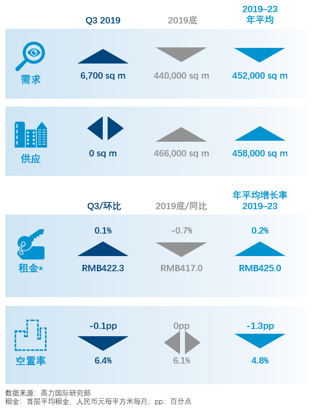 本季无新项目入市,第三季度全市甲级写字楼平均租金基本维持稳定,空置率小幅下降。全市整体空置率15.2%,平均租金106.4元每平方米每月。