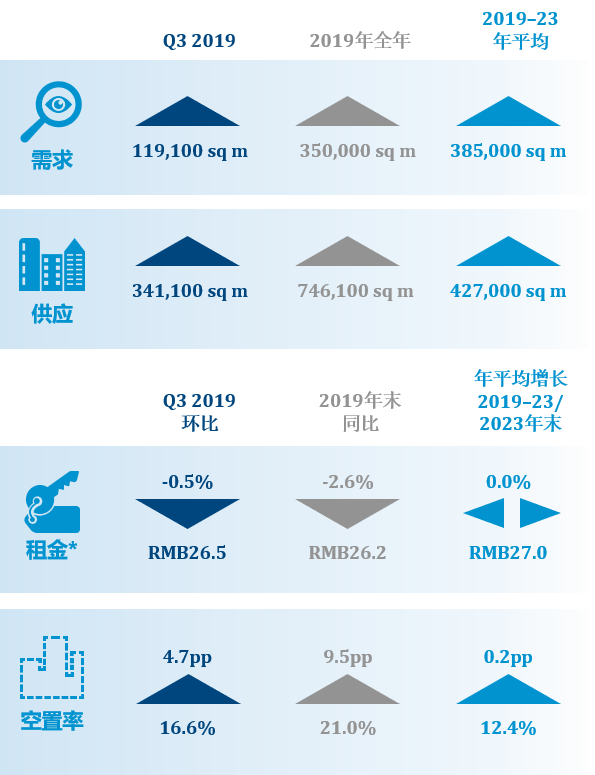 经济放缓,是成都甲级写字楼吸纳量减少的主要原因。同时,部分大型国有企业及其下属企业搬去自用大楼,导致第三季度全市净吸纳量仅为18,800平方米,但由于2019年第三季度无新项目入市,全市整体空置率环比小幅下降0.7个百分点至15.2%。